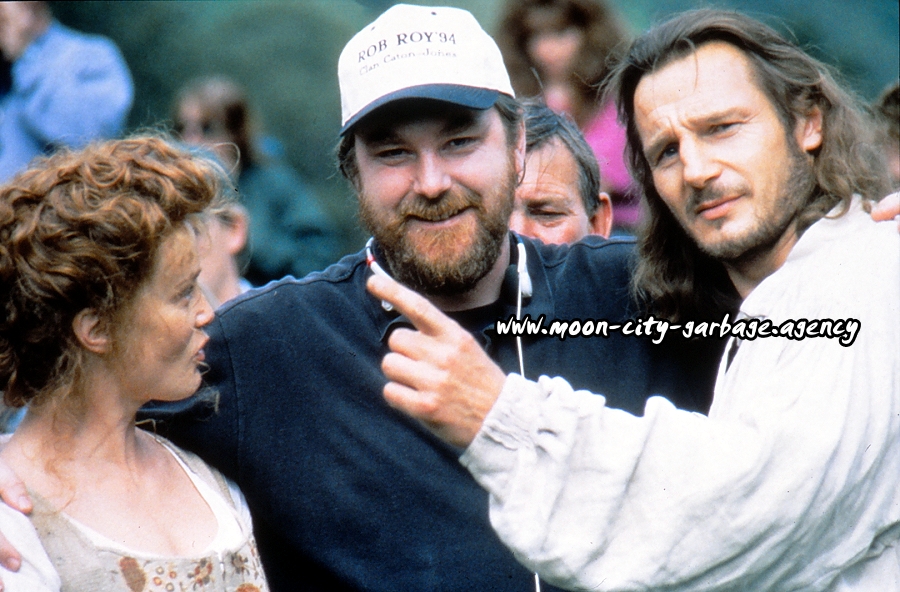 Director Michael Caton-Jones in T-Shirt and kilt (!) with Liam Neeson and Jessica Lange.