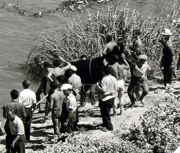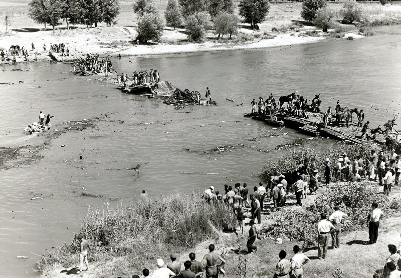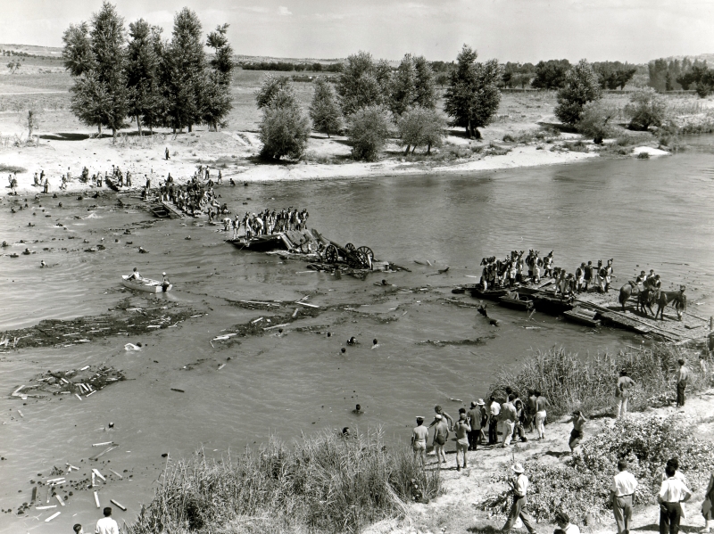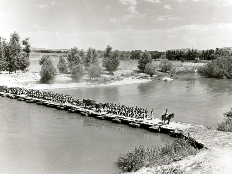 Rio Tajo 1956 - So many Extras on a rickety bridge. Something will happen!