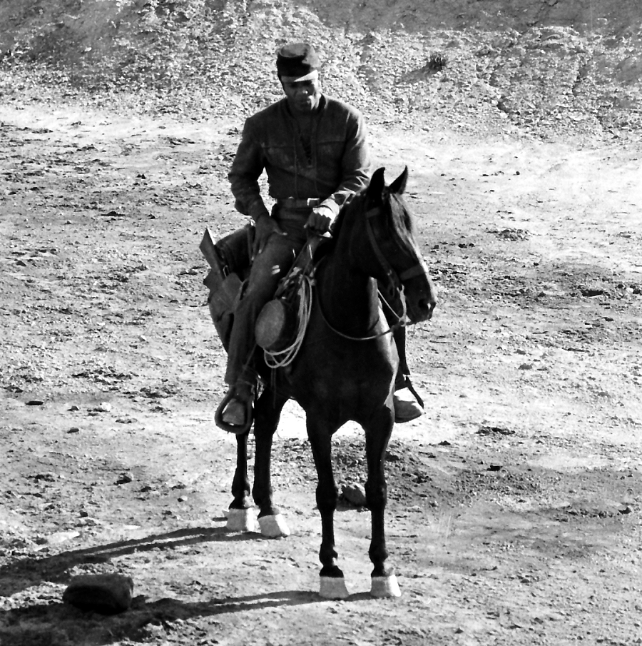 One of the few scenes in which Lee actually sitting on the horse.