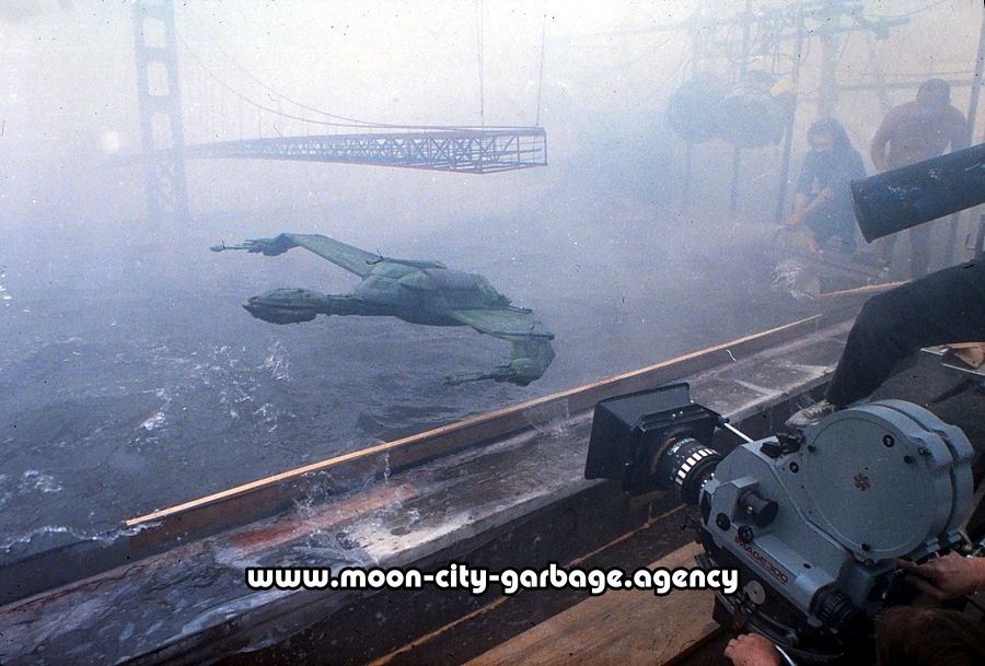 The 'Bird of Prey' miniature was on a wire rig for the flight under the bridge and the crash.