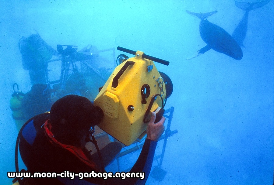 Cameraman Pete Romano needs the help of several other divers to get the whales in the