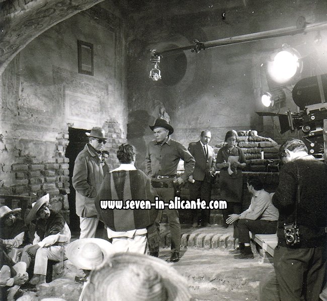 | Director Burt Kennedy with Yul Brynner on the Studio Set built by Jose Alguero in the Samuel Bronston Studios (Chamartin). In the Background Script Supervisor Miss Lucie Lichtig! Burt Kennedy on Yul Brynner: "The last time I saw him was at the airport in Madrid. He put his arms around me and said, "God bless you, Burt." I said, "God bless? I thought you were Buddhist." We had a last laugh together and he was gone. I've missed him ever since." ("Hollywood Trail Boss") |