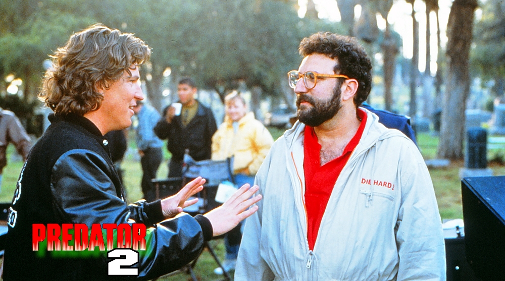 Director Stephen Hopkins in discussion with the Predator (Kevin Peter Hall).